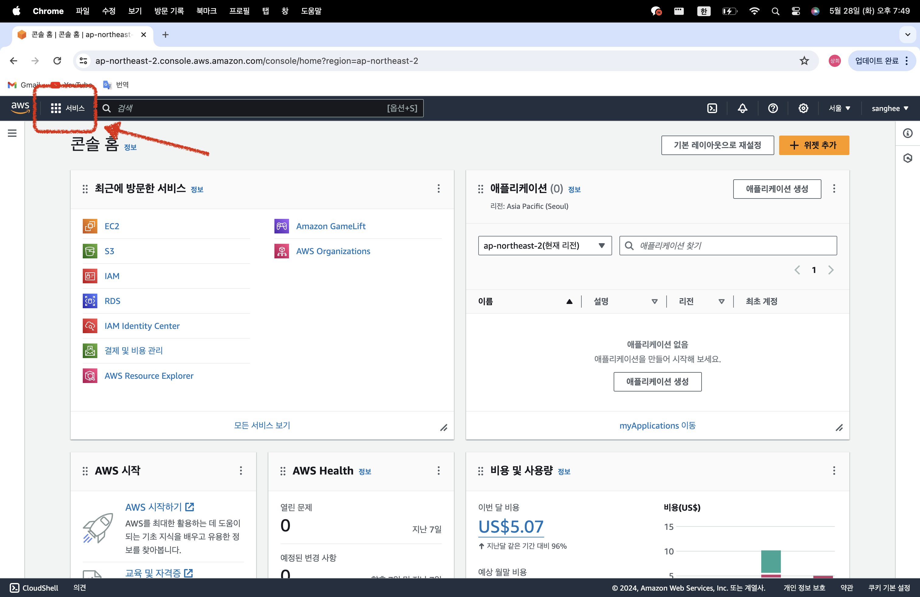1. aws 홈에 접속 후 좌측 상단 메뉴에서 서비스 탭 클릭, EC2 선택 / 또는 검색창에 EC2 입력