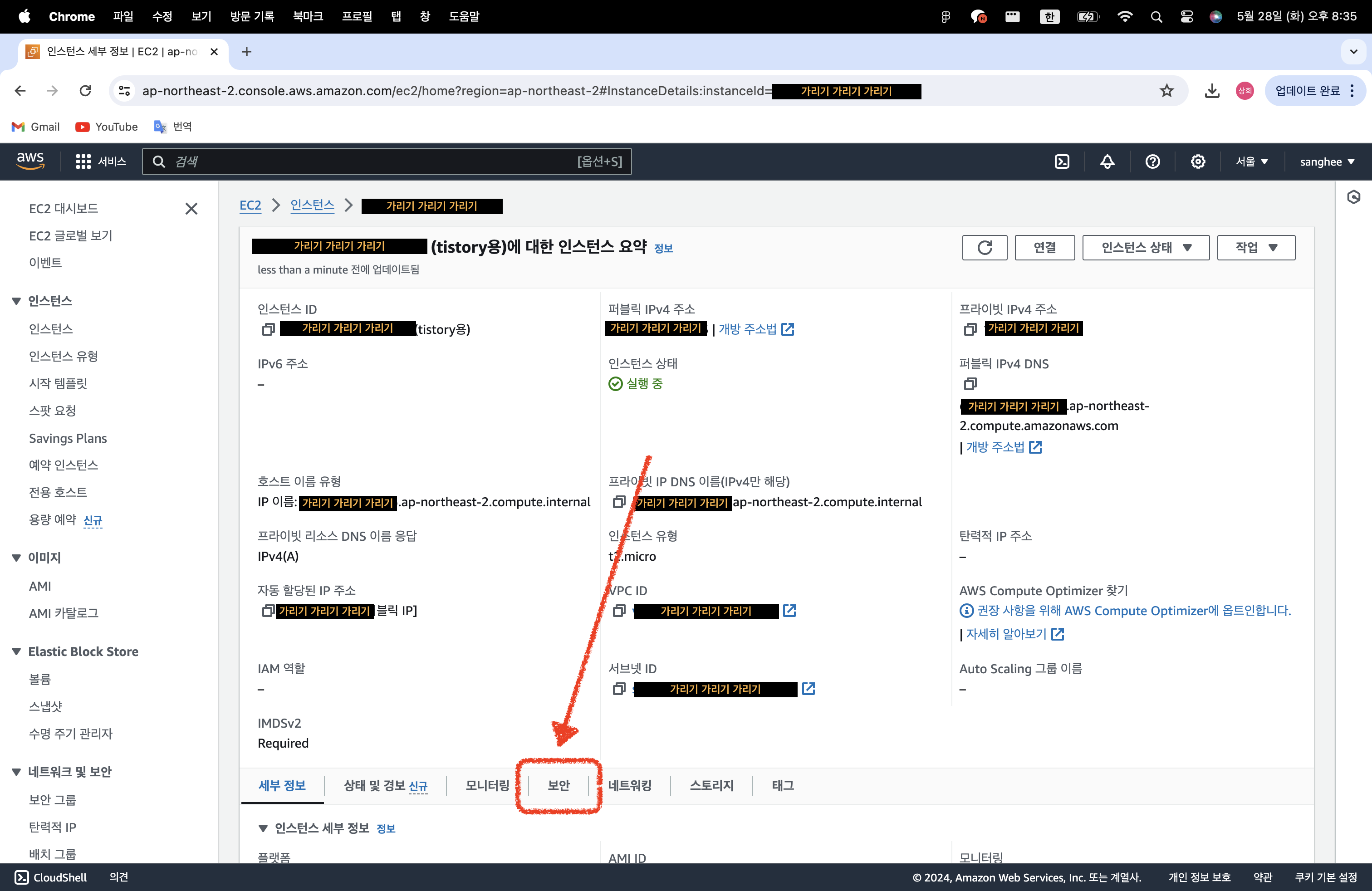 - '인스턴스 ID' 클릭 후 '보안' 클릭