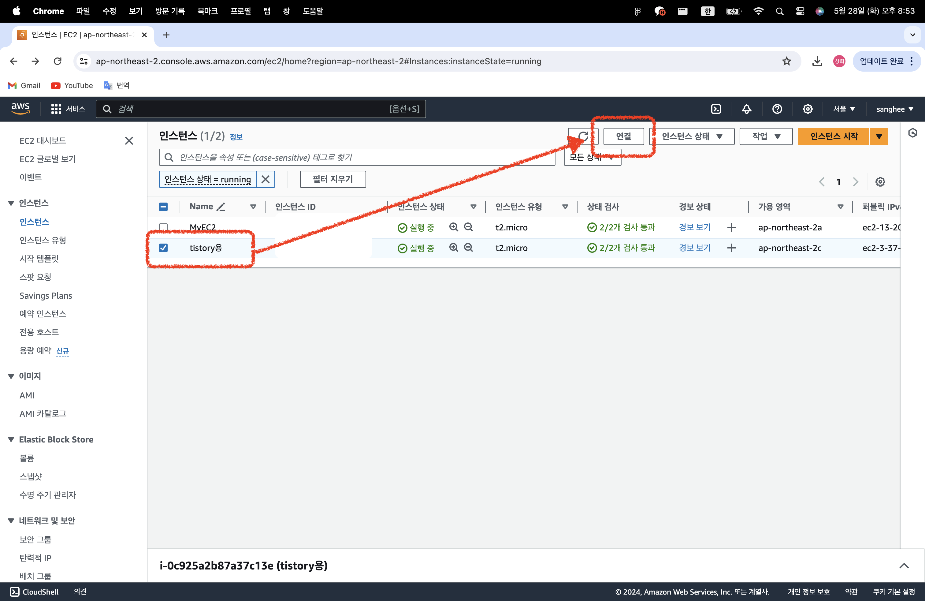 - 생성한 인스턴스 체크 후, '연결' 클릭