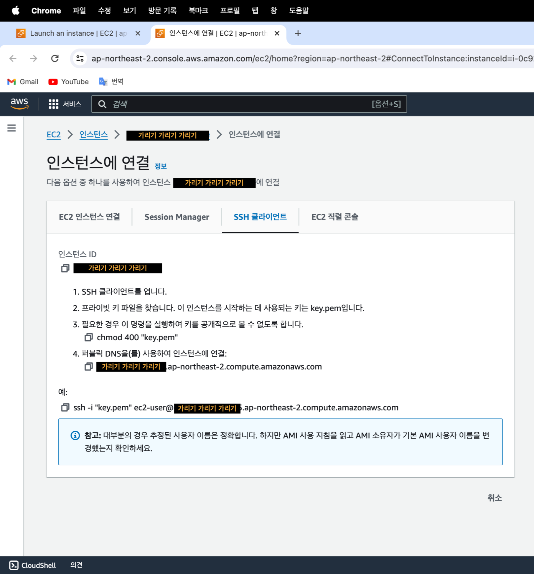 - <가이드>에서 복붙한 [chmode 400 "키 이름.pem"] 입력 (안하면 오류날수도)