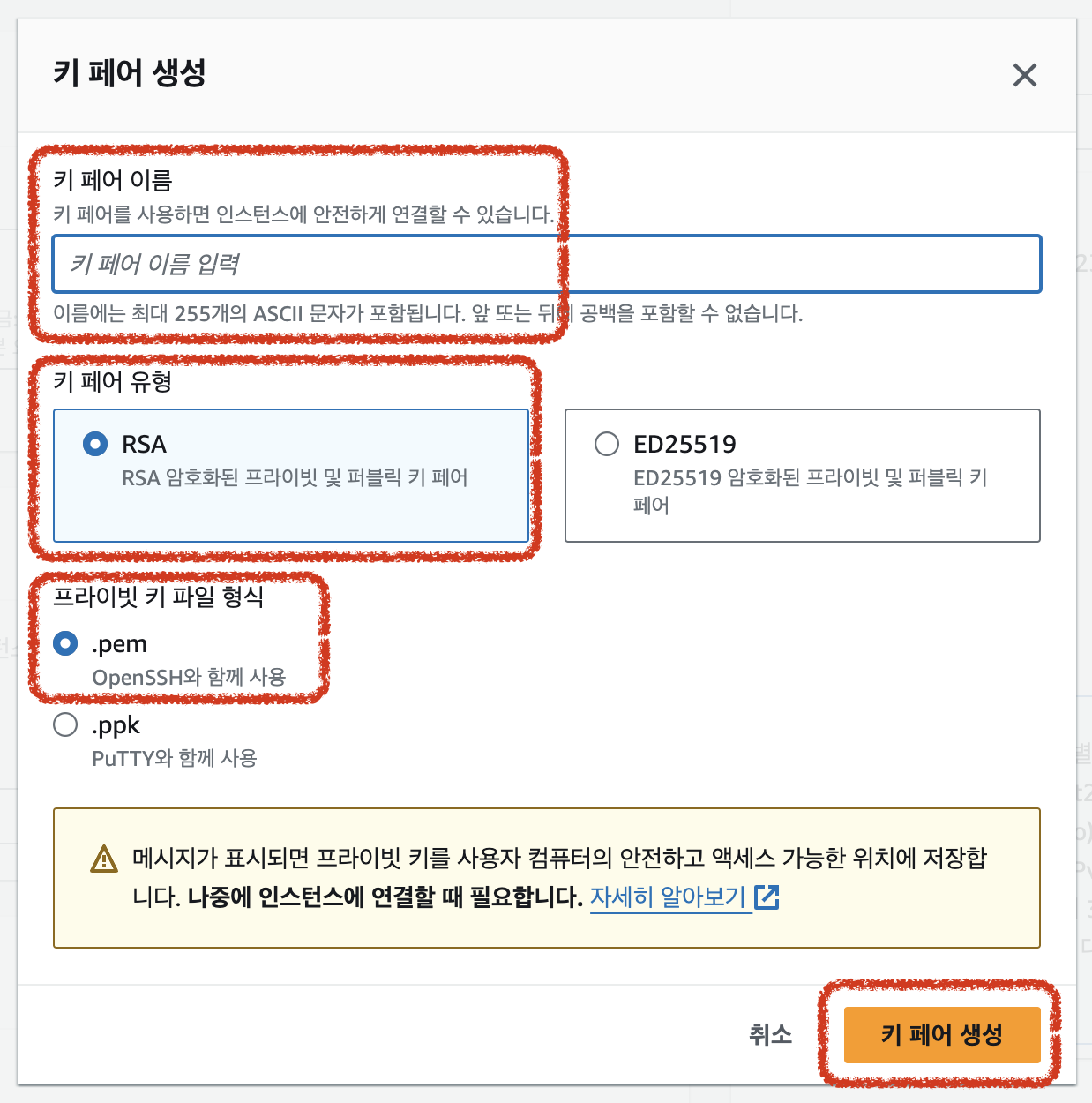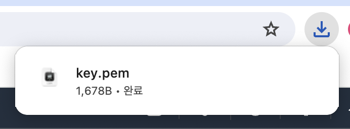 - 키페어 생성 누르기 → 바로 다운로드됨, Downloads 폴더에서 확인 가능