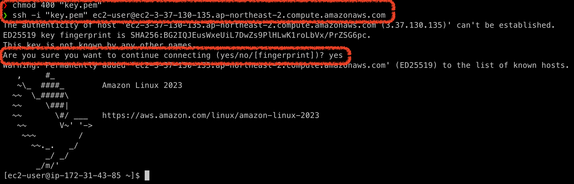 - <가이드> 에서 복붙한 [ssh -i "키 이름.pem" ec2-user@퍼블릭DNS] 입력