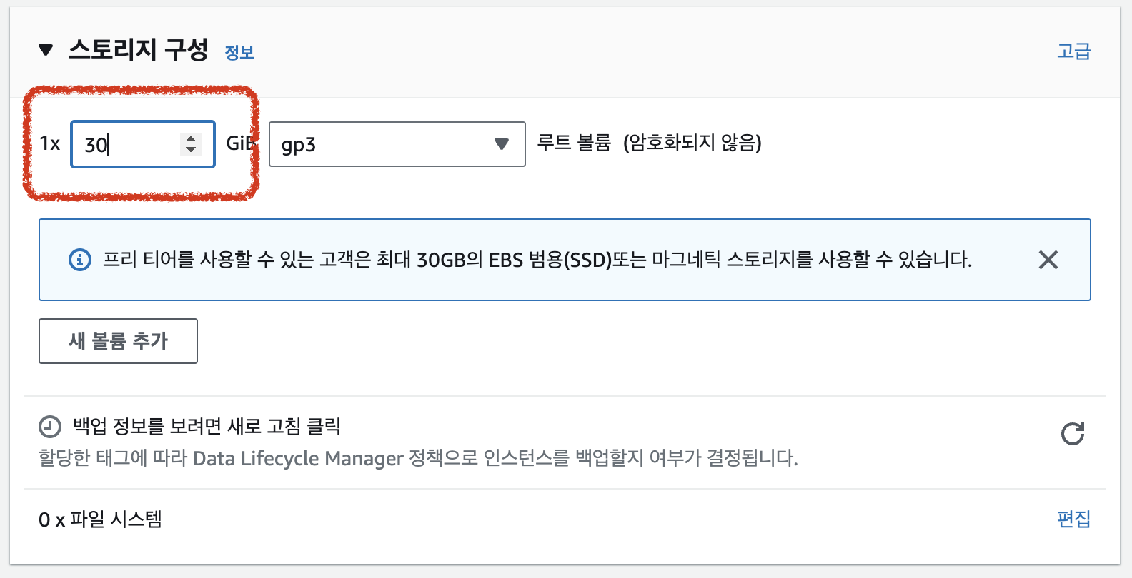 - 프리티어는 최대 30gb 사용 가능하므로 30gb로 설정