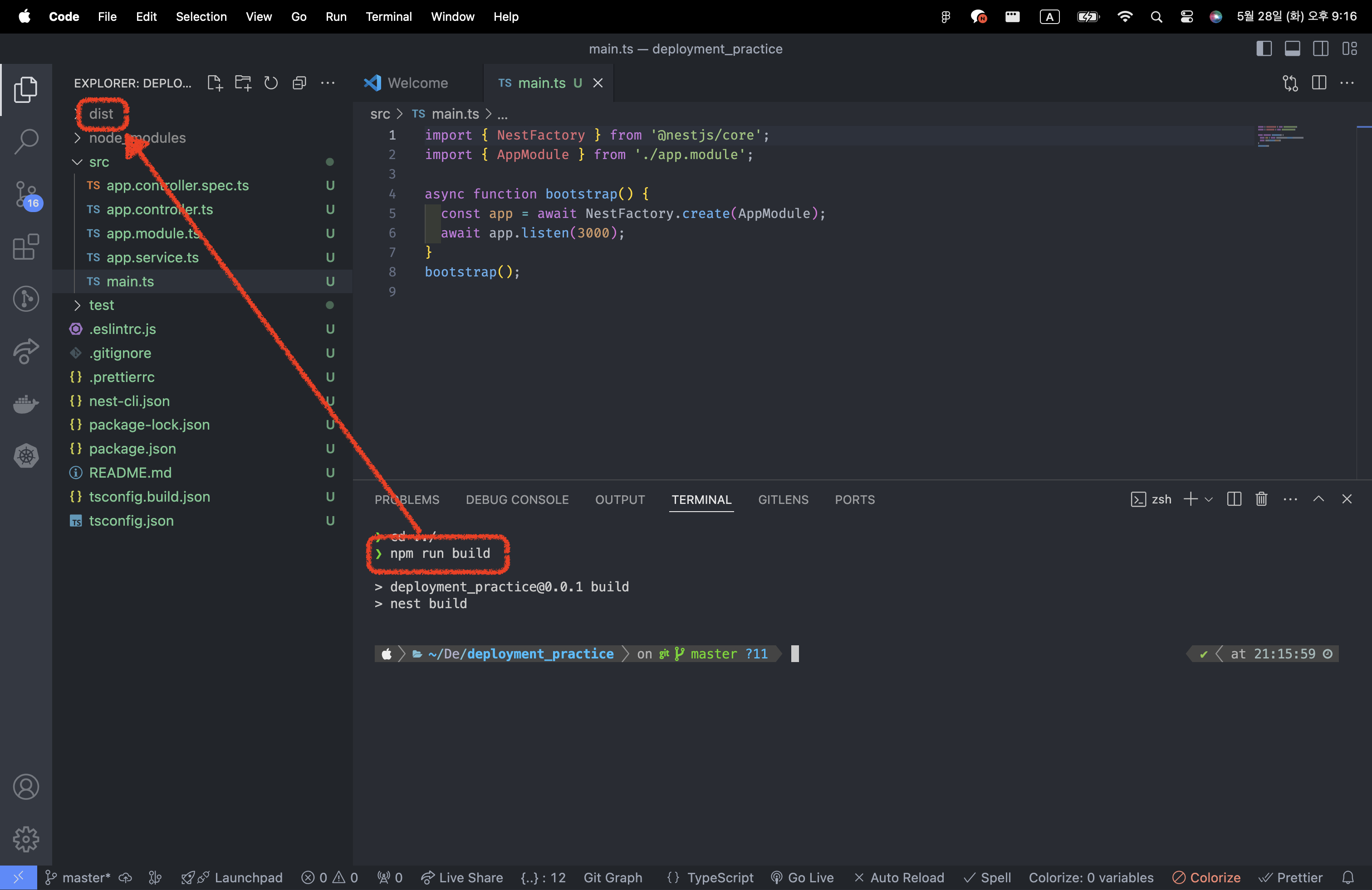 - 빌드할 파일을 열고, npm run build 명령어를 입력하여 dist 파일을 생성해줌