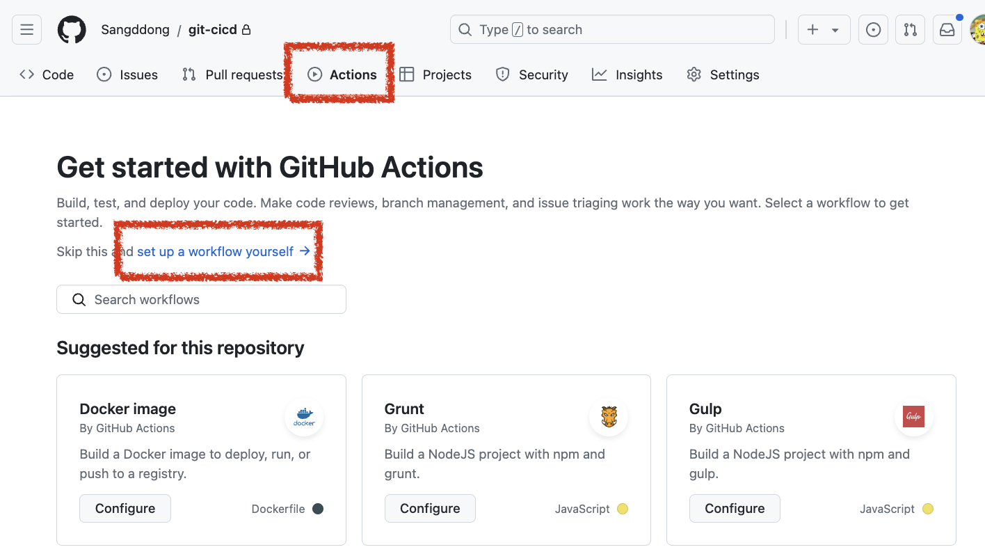 - 하지만 set up a workflow yourself를 클릭해 직접 작성해보도록 한다