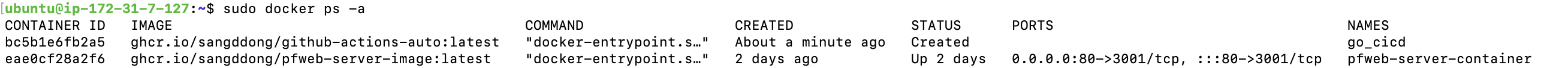 우선 로컬에서 인스턴스에 접근한 후, sudo docker ps -a 명령어로 리스트를 확인해보았다
